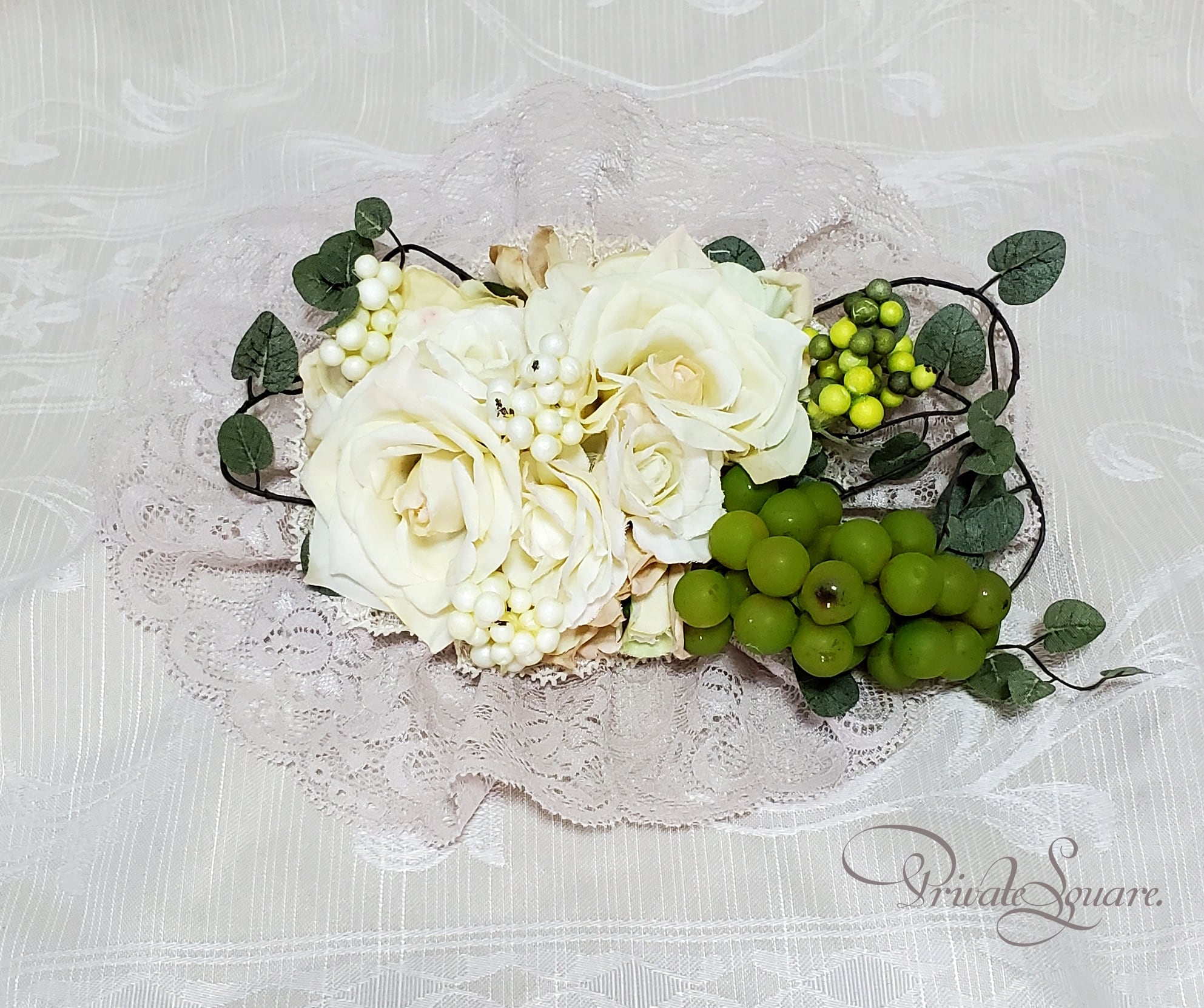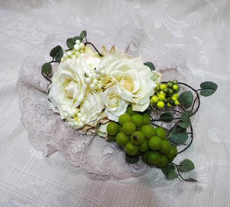 ・花材:クリームホワイト、グリーンなど(葡萄、少し経年感のある加工がされています)